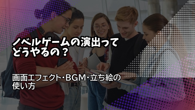 画面エフェクト、BGM・SE、立ち絵の見せ方、テキスト表示の工夫で、プレイヤーの感情を動かせます。